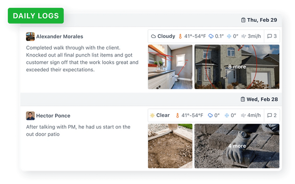 Stay in the loop about what’s happening on the construction site, even when you can’t be there in person. View detailed updates on the progress made, tasks completed, and any notes from the crew.